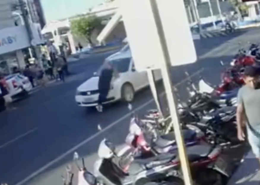 Uma câmera de segurança registrou o momento em que uma mulher foi atingida por um carro enquanto atravessava a rua Coronel Gurgel, no Centro de Mossoró. As imagens mostram o veículo vindo da rua Santos Dumont em direção à Coronel Gurgel, quando a pedestre corre para tentar atravessar a via.